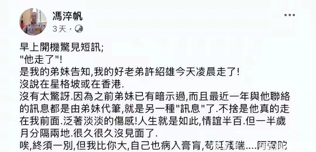 再看看老冯,临走前还在为好兄弟“欢喜哥”许绍雄的去世伤心,说“贤弟那边等,愚兄随后来”,没想到一语成谶。欢喜哥走后,也有人编排他的桃色新闻。这些“牛鬼蛇神”,为了点流量,连对逝者最基本的尊重都不要了。
