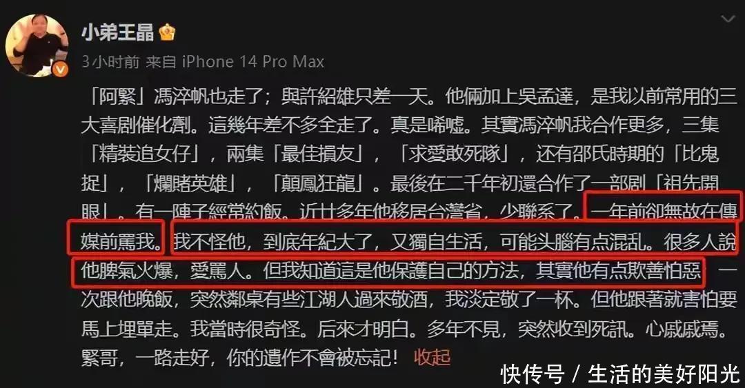 老冯演了一辈子喜剧,把快乐都留给了我们,自己却走得这么冷清。咱们能不能多念及一点别人的好?人走了,往事就该随风而去,多留点善意,少点算计吧。只希望天堂没有病痛,他能和“欢喜哥”他们,再热热闹闹地演上一场。